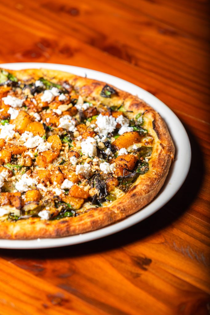 PESTO PUMPKIN PIZZA – Roast pumpkin, pesto, caramelised onion, persian feta, spinach and crushed walnuts. $28